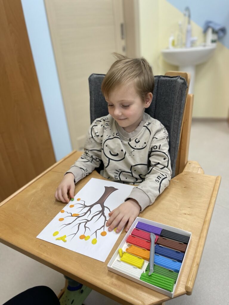 Були проведені ігри «Кленовий листочок», «Лісові дари», «Ознаки осені» та «Запаси білочки». Дитина виконала пальчикову гімнастику, а також створила творчу роботу — пластилінографію «Осіннє дерево».